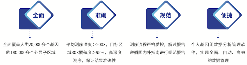对超过20,000个基因(共计超过180,000个外显子)进行目标区域富集与高深度测序,并利用个人基因组分析管理软件自动化分析测序数据。不仅能够全面解读OMIM数据库中所有致病基因明确的单基因遗传病,还可通过对家系样本分析,寻找新的致病基因。