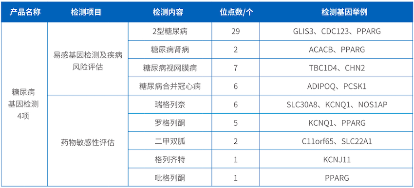 并且通过对瑞格列奈、罗格列酮、二甲双胍、格列齐特、吡格列酮五种常见糖尿病治疗药物相关基因进行检测,提高药物的治疗效果,避免药物不良反应,为糖尿病疾病个性化用药提供指导。
