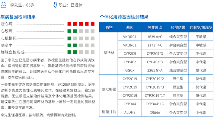 通过对华法林、氯吡格雷、硝酸甘油三种常见血栓治疗药物相关基因进行检测,提高药物的治疗效果,避免药物不良反应,为血栓性疾病个性化用药提供指导。