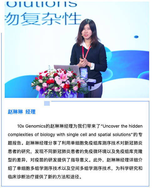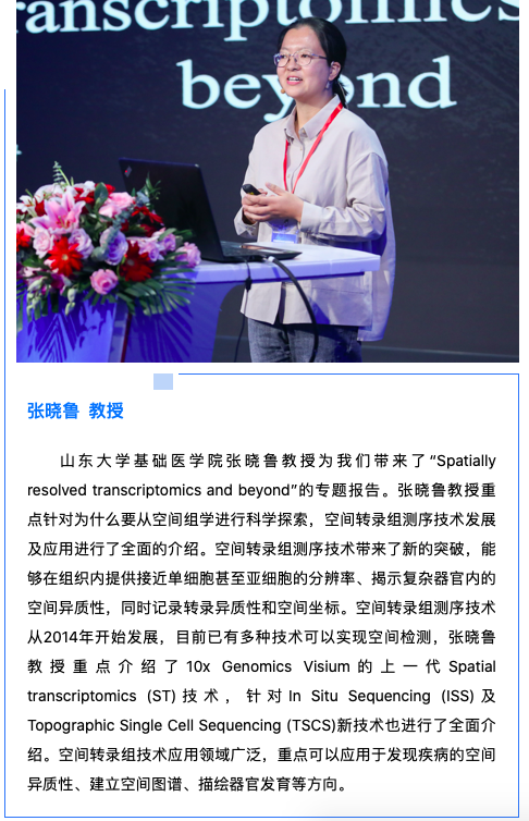 清华大学医学院研究员、博士生导师,生物芯片北京国家工程研究中心常务副主任,博奥生物集团有限公司高级副总裁,北京博奥谈球吧生物技术有限公司总裁邢婉丽女士为本次会议进行了开幕式致辞。邢婉丽总裁表示单细胞测序技术及空间转录组技术在生命科学和医学研究领域的应用日益受到关注,为高分辨率研究细胞分群和组织功能研究提供重要的支撑,对发现组学间关系、记录动态生物活动具有非常重要的意义,为科学界和医学界更加深入地去认识生命的本质,解析胚胎发育过程、肿瘤发生发展、新冠肺炎免疫机制、发现新的生物标志物和治疗靶点等提供全新而绚烂的研究视角。邢婉丽总裁对所有报告嘉宾及参会嘉宾的到来表示热烈欢迎及衷心感谢!
