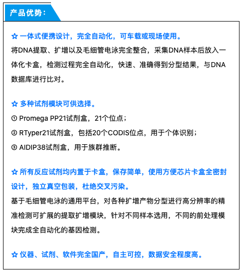 该系统基于微流控芯片技术,配套全集成芯片卡盒和数据分析软件,集DNA提取、PCR扩增、毛细管电泳于一体,自动生成分型结果,2小时即可获得DNA分型。既可用于重大事故、自然灾害的人员身份快速识别和案件现场检材的快检快筛,也可用于边防、公安等基层机关对敏感、可疑人员身份的快速识别和排查。仪器操作简单便捷,无需专业技术人员操作,可检测的样本包括:血卡、唾液卡、口腔拭子卡等。无使用环境要求,既可在实验室、办公室、窗口单位,也可与警用现勘车配套移动式检测,具有良好的抗震性、防污染措施,使用无需校准。同时兼容多款国内外DNA试剂,具备个体识别和族群推断功能。