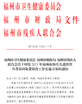福州市新生儿耳聋基因筛查项目将在5月1日于指定采血机构全面展开,筛查对象为在福州市指定采血机构出生的常住人口新生儿(筛查对象需提供父母一方的身份证、户口簿或居住证复印件),采用耳聋基因芯片检测技术,对新生儿四个常见耳聋基因的15 个突变位点进行检测。联合物理听力筛查,准确做出耳聋病因分析,提出早期干预措施,减少听力疾病儿童的发生率,真正实现“早发现、早诊断、早干预”,达到有效预防出生缺陷的目标,减轻家庭和社会负担,促进社会和谐发展。