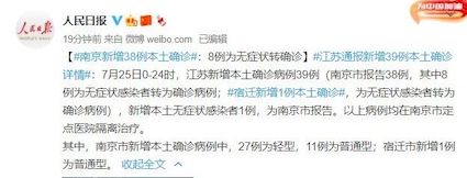 江苏省卫健委今日通报,江苏新增本土确诊病例39例(南京市报告38例),新增本土无症状感染者1例,为南京市报告。7月25日起,南京市开始对全市常住人口、来宁人员开展第二轮全员核酸检测。当前,南京已有多个新冠肺炎疫情中高风险区域,疫情防控形势依然严峻、尚未明朗,全市疫情防控工作正处于防扩散、防外溢的紧要关头。