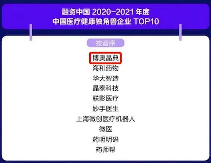 本次评选中获得2020-2021年度中国医疗健康独角兽企业TOP10的荣誉,进一步力证了博奥谈球吧在生命科学领域的发展潜力,也再次显示了业界对博奥谈球吧的关注与肯定。