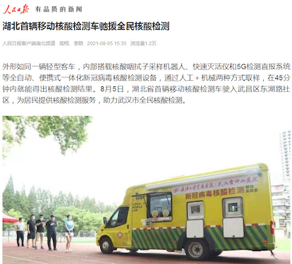作为科技抗疫的标志性成果,新冠病毒核酸检测移动实验室可以让核酸检测更加准确便捷,安全快速,接通220V民用电或启动车上自带的发电机即可正常工作,采样可通过口咽拭子采样机械臂和人工两种方式完成。其装载的全集成芯片实验室系统45分钟即可完成全程实验,最快35分钟报告阳性结果,检测灵敏度可达150拷贝/毫升。如此出色的性能使其特别适合在社区发生聚集性疫情和县乡村等医疗条件相对较差的场景下发挥优势。在为市民完成检测后,检测结果会通过5G通信系统实时上传到医院的核酸检测实验室,经过审核后上报武汉市卫健委的核酸检测系统。“轻骑兵”每天可以完成近800份样品的检测,为武汉市全民核酸检测提供有力支持,在此次武汉疫情中发挥了积极作用。