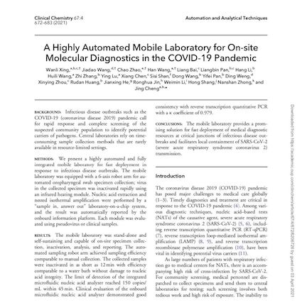 这一抗疫利器的研发成果以题为"A Highly Automated Mobile Laboratory for On-site Molecular Diagnostics in the COVID-19 Pandemic"的研究论文于2020年4月在国际检验医学界权威杂志《临床化学》(Clinical Chemistry)重磅发表,该论文详细阐述了“轻骑兵”的性能特点和检测能力等成果,得到了国内外广泛关注。该项重量级抗疫攻关科研成果的发表,为新冠病毒核酸检测移动实验室快速部署医疗诊断系统提供了一种有发展前景的解决方案,有助于控制新冠病毒的区域性传播。