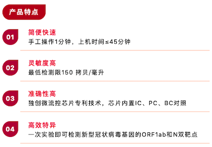 基于全新一代先进的芯片实验室(Lab-on-a-chip)设计理念,化繁为简,检测时仅需将样本保存液加入芯片,封闭芯片后即可上机,手工操作小于1分钟。生物反应全程(包括核酸提取、核酸纯化、扩增反应、核酸检测和结果判读等)均集成在一个整体密闭、内部分区的微流控芯片内,由全自动核酸分析仪完成,因此无需专业分区实验室,无需人工干预,最大程度降低操作人员感染及样本间交叉污染的风险。45分钟完成实验全过程,最快可在35分钟内检出新冠阳性样本,检测灵敏度可达150拷贝/毫升,在截至目前国内获批的同类产品中灵敏度最高,真正实现“样本进-结果出”。