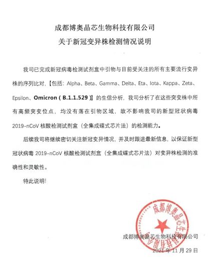 目前,旗下成都博奥晶芯生物科技有限公司已完成新冠病毒检测试剂盒中引物与目前主要流行变异株的序列比对【包括但不限于:Alpha、Beta、Gamma、Delta、Eta、Iota、Kappa、Zeta、Epsilon、Omicron(B.1.1.529)】,结果证实:博奥谈球吧已上市的新型冠状病毒2019-nCoV核酸检测试剂盒(全集成碟式芯片法),不会出现脱靶和漏检的情况。后续,博奥谈球吧将持续紧密追踪全球新冠病毒变异株的最新动态并及时跟进最新信息,确保全集成新冠病毒核酸检测芯片试剂盒对变异株检测的准确性和灵敏性。