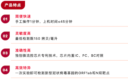 基于全新一代先进的芯片实验室(Lab-on-a-chip)设计理念,化繁为简,检测时仅需将样本保存液加入芯片,封闭芯片后即可上机,手工操作小于1分钟。生物反应全程(包括核酸提取、核酸纯化、扩增反应、核酸检测和结果判读等)均集成在一个整体密闭、内部分区的微流控芯片内,由全自动核酸分析仪完成,因此无需专业分区实验室,无需人工干预,最大程度降低操作人员感染及样本间交叉污染的风险。45分钟完成实验全过程,最快可在35分钟内检出新冠阳性样本,检测灵敏度可达150拷贝/毫升,在截至目前国内获批的同类产品中灵敏度最高,真正实现“样本进-结果出”。