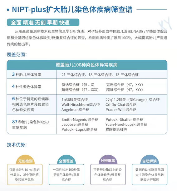 基于胎儿游离DNA浓度富集的专利技术(专利号:CN107541561B),博奥谈球吧依托新一代高通量基因测序平台开展的胎儿染色体微缺失/微重复无创产前基因检测(NIPT-plus),通过采集孕妇外周血并提取胎儿游离DNA,运用高通量测序技术和生物信息学分析方法评估胎儿染色体拷贝数异常的风险,将检测疾病种类扩展到100种,并行筛查非整倍体综合征和全基因组染色体微缺失/微重复综合征,针对染色体异常综合征的筛查覆盖率达到80%,大幅提高胎儿严重遗传病的检出率。