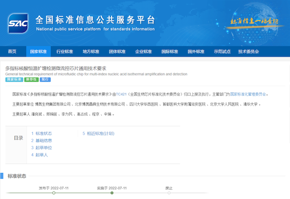 近日,国家市场监督管理总局、国家标准化管理委员会发布《中华人民共和国国家标准公告》2022年第6号和第8号,由博奥生物集团有限公司主导制定的国家标准《微流控芯片核酸恒温扩增仪技术要求》(GB/T 41407-2022),《多指标核酸恒温扩增检测微流控芯片通用技术要求》(GB/T 41521-2022)获准颁布,分别于2022年4月15日、2022年7月11日起正式实施。两项新标准的颁布完善了我国核酸扩增检测技术领域的标准内容,使相关技术所涉及产品应用与服务更加规范、具有较强的指导性。