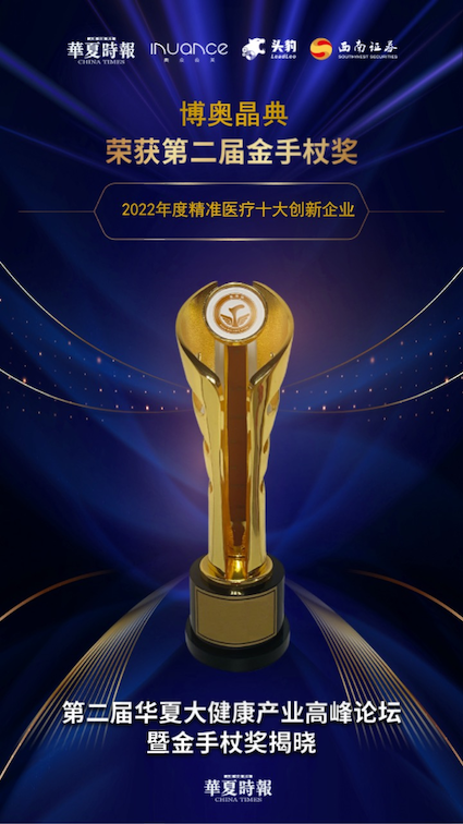 岁末年初,博奥谈球吧凭借在精准医疗领域的多项核心专利技术和高质量创新产品,在近日由华夏时报社、兰州新区管委会等单位共同主办的第二届华夏大健康产业高峰论坛暨金手杖奖颁奖盛典上喜获“2022年度精准医疗十大创新企业”。此次获得2022年度精准医疗十大创新企业,是对博奥谈球吧科技创新能力的充分肯定,亦是对博奥谈球吧行业龙头地位的高度认可。