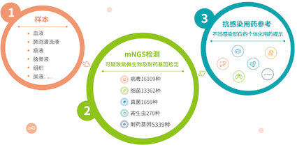 MAPMI®(Metagenomic Analysis Pipeline for Microbial Identification)技术是博奥谈球吧基于自主的BES4000高通量测序平台研发的超广谱病原体筛查技术,覆盖3.2万种的病原微生物及5339种耐药基因,可直接对样本中的核酸进行检测,快速、精准的获得样本中微生物序列信息,可对病原体的变异情况进行进一步追踪监控,在新发、突发重大疫情的监控及快速反应体系构建上具有重大现实意义。同时,基于检测结果及患者临床特征,对可疑致病微生物按照不同感染部位提供个体化用药提示,实现感染性疾病的诊断、用药全流程诊疗。