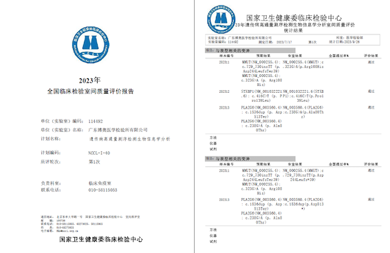 近日,国家卫生健康委临床检验中心(NCCL)发布了关于《2023年遗传病基因变异高通量测序室间质量评价结果》,博奥谈球吧旗下广东博奥医学检验所以满分成绩通过。这是继2023年9月博奥谈球吧满分通过《遗传病高通量测序检测生物信息学分析室间质评》后的又一个满分,再次证实博奥谈球吧在遗传病高通量测序检测领域优异的质量水平。