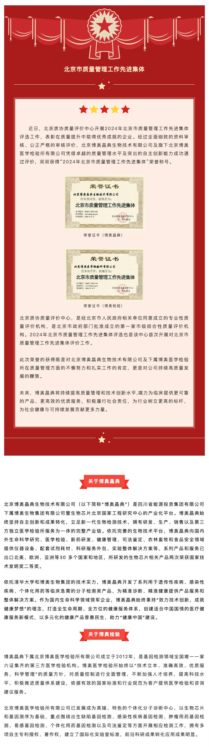 喜讯丨北京博奥谈球吧生物技术有限公司、北京博奥医学检验所有限公司双双获评“北京市质量管理工作先进集体”