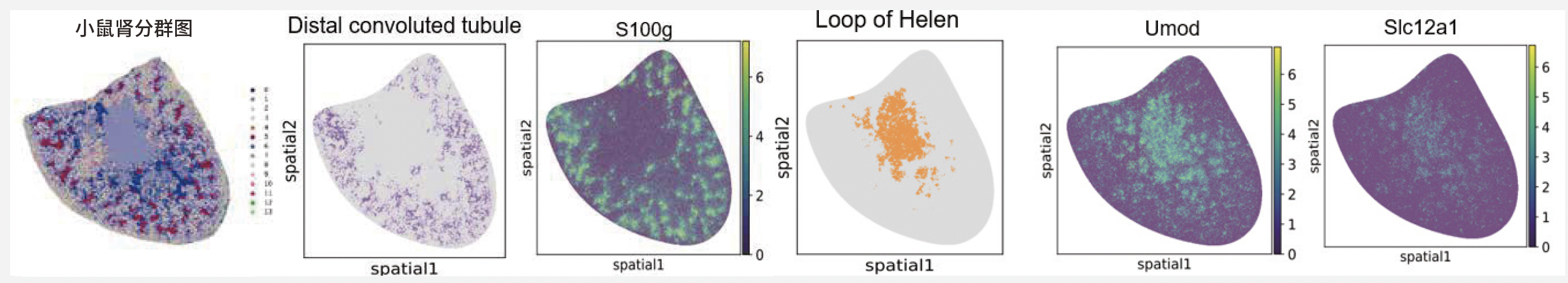 使用博奥谈球吧高分辨率空间转录组平台, 构建了小鼠肾的高分辨率空间转录组图谱,揭示了肾组织空间分区结构(图3)。其次,小鼠肾基因表达图谱与HE 染色结果相结合可以清晰的了解各细胞类群的基因表达及相互作用,揭示它们对疾病发生、发展、治疗、预后评估的价值。